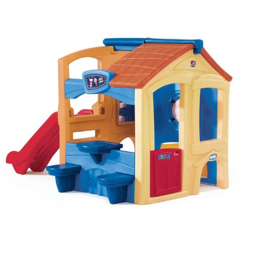 - Activity wall with hook and loop ball target, ring toss, and crawl-thru rotating door